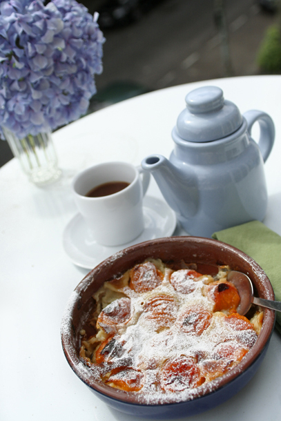 I always liked a traditional cherry clafoutis, a sort of sweet gratin of fresh cherries, that’s usually eaten as a dessert. It doesn’t have to be made with cherries – apricots make a great substitute. And as this dish is egg based, I thought this warm, fresh from the oven, fruity gratin would make a great brunch dish.