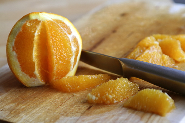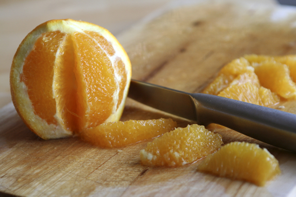As for filleting the orange, I used to think it requires the knowledge of some chef trick and was worried about creating a big mess trying to get out some clean orange segments. From a cookery class at Leith’s cookery school I then learned that it isn’t very hard, as long as you have a very sharp knife. You have to cut off one end of the orange to create a flat surface, before you can start cutting away at the orange so the orange doesn’t move about. And don’t be shy to be quite generous when cutting away the peel to make sure the orange segments are clean of all pith.