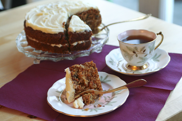 The recipe for this cake is from Pret A Manger’s cookbook Food on the Move. I always liked their carrot cake and this recipe gives you a very similar result. Pineapple pieces are added to the batter, giving the cake some juicy bursts of fruit.