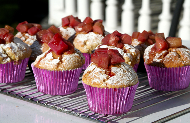 I particularly like the look of the muffins with the fruit compote on top, as if a little muffin volcano is erupting with juicy fruits. I’d recommend getting the pink rhubarb stalks, rather than the ones that are mainly green, as the pink colour will look much nicer on top of the muffins. I also choose thin stalks, as again they will look better, more delicate, on the muffins.