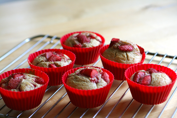 Pour the mix back in to a bowl and fold the strawberry pieces under, except the ½ cup you set aside earlier! Spread the dough evenly between 12 silicone muffin cups and use these strawberry pieces you set aside earlier to top about a teaspoon worth of them in the middle of each muffin.