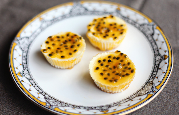 The next morning, scrape the flesh of the passion fruits out (you need about 100g) in to a pot, add the juice and heat but don’t let it boil. In the meantime soak the gelatine as per packet instructions, then squeeze the excess water out of the gelatine and dissolve the leaves – one after the other – in the passion fruit juice. Spread on the cake and leave to set in the fridge for 60 minutes.
