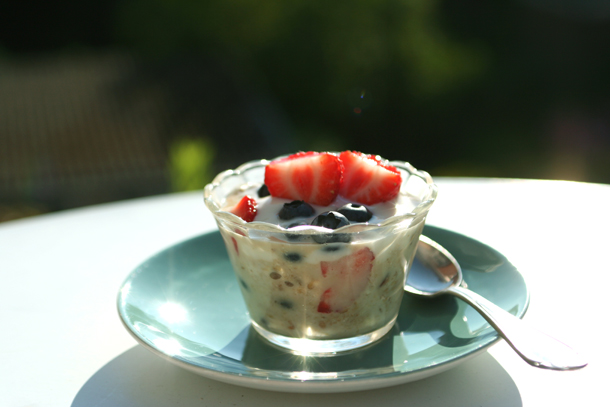 In the morning add as much yoghurt and as many berries as you like. I tend to stir everything in and then top it with another dollop of yoghurt and a few more berries.
