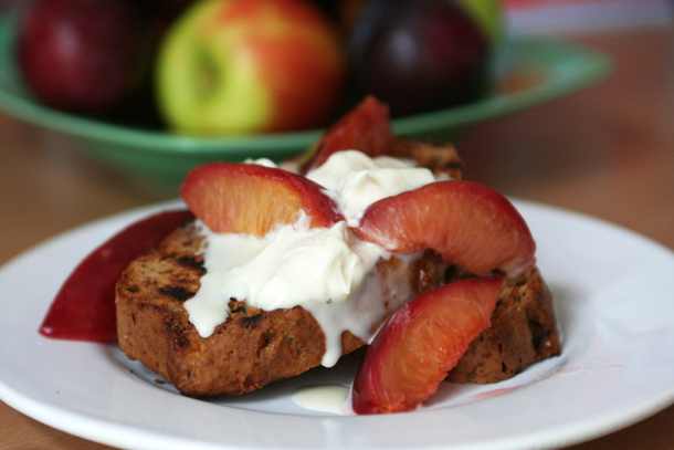 I looked for a fat free banana bread receipe, which I found on Gourmet Getaways, as I like to top it with a generous helping of mascarpone and figured that would be rich enough. As for the fruit compote, you could go with any fruit of your liking but I since plums are in a season right now, that’s what I’d recommend. You could use the plum compote receipe that I gave out for the oat pancakes a while ago.