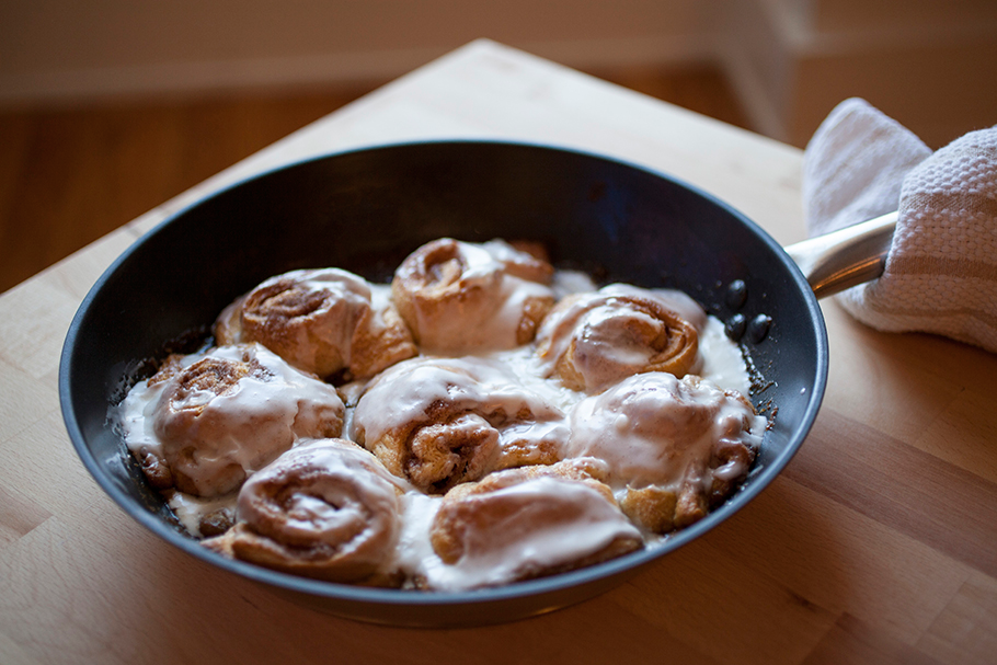 And here it is: a cheat’s receipe for cinnamon buns and you won’t need any special bakeware for it either – I just used the iron frying pan.