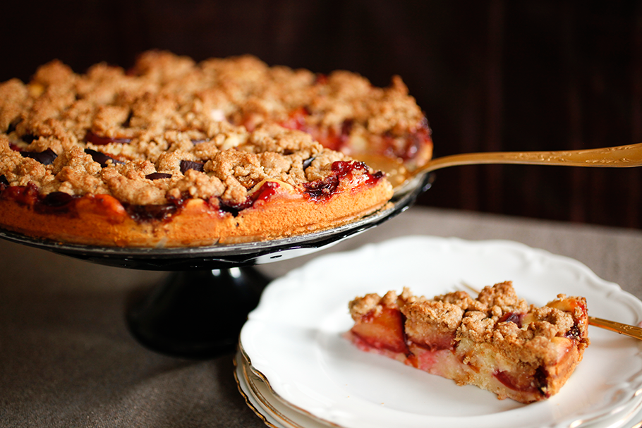 Mix the flour, ground almonds, cinnamon and sugar then add the cold butter, cut into cubes, and rub it in the flour mix to get crumbs. Pour those over the pre-baked cake once the 25 minutes of baking time are over and bake it for a further 25 minutes.