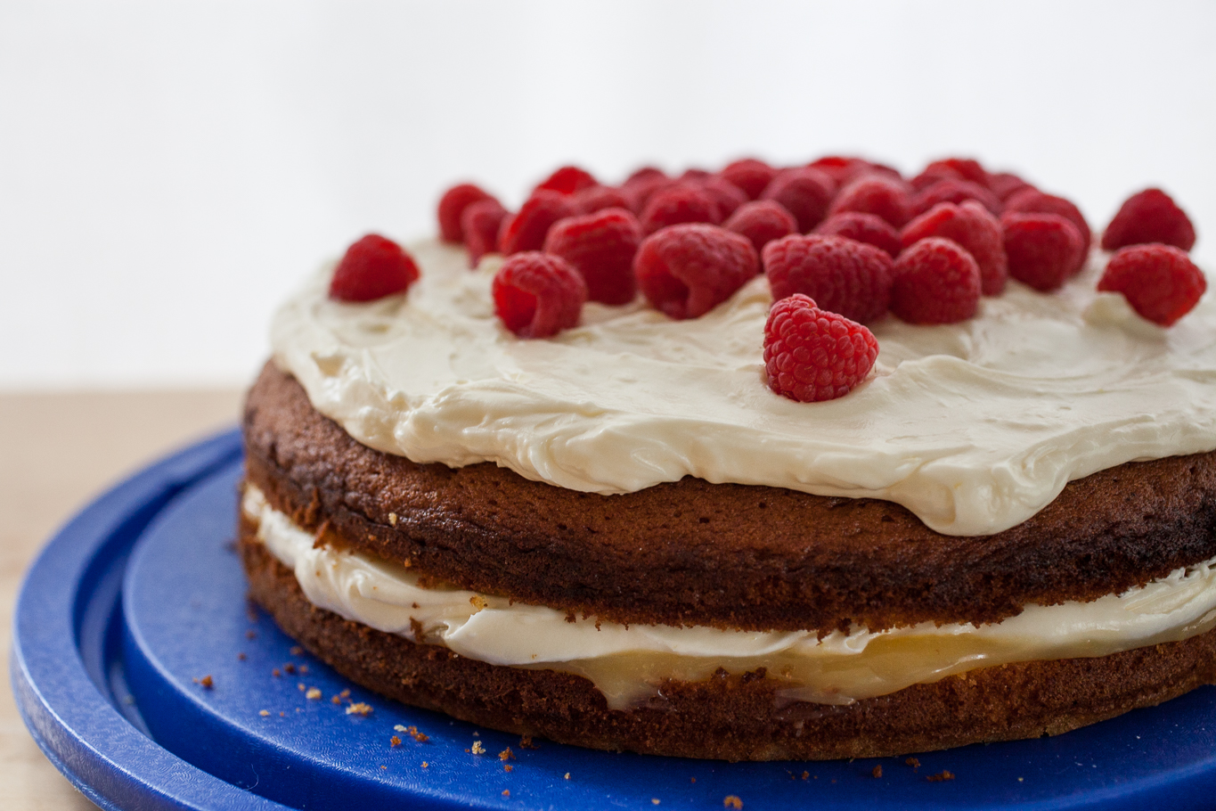 Once the cake is cooled, halve the sponge horizontally into two rounds. Spread the lemon curd onto one of the cooled sponges, then layer over half of the icing and half (or a third) of the raspberries. Cover with the other sponge and spread the rest of the icing on top and decorate with the left over raspberries.